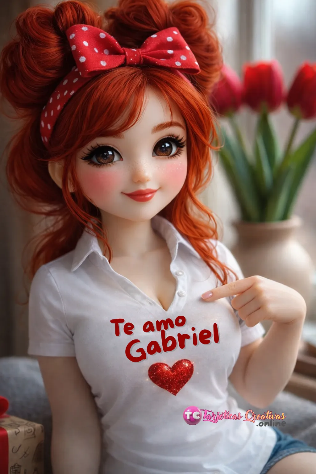 "Diseño romántico con ilustración de mujer pelirroja y detalles de amor personalizados"