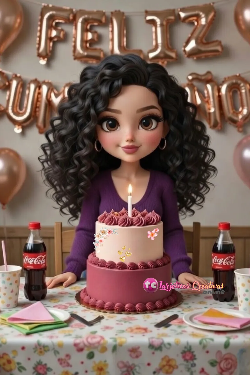 "Diseño de feliz cumpleaños para mujer con pastel decorado, globos festivos y estética elegante"