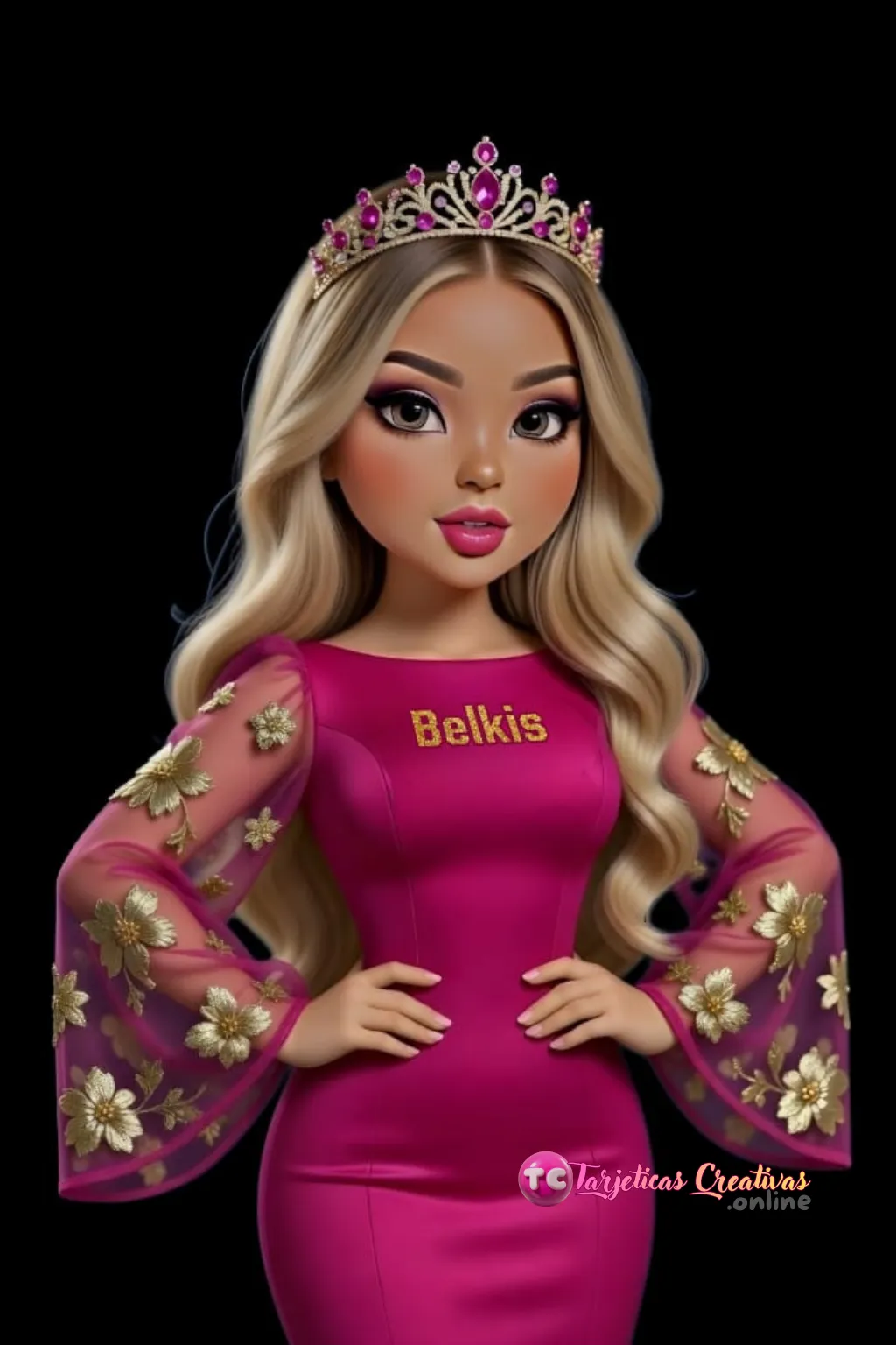 "Diseño elegante de reina con corona de cristales fucsia y vestido de alta costura con detalles dorados"