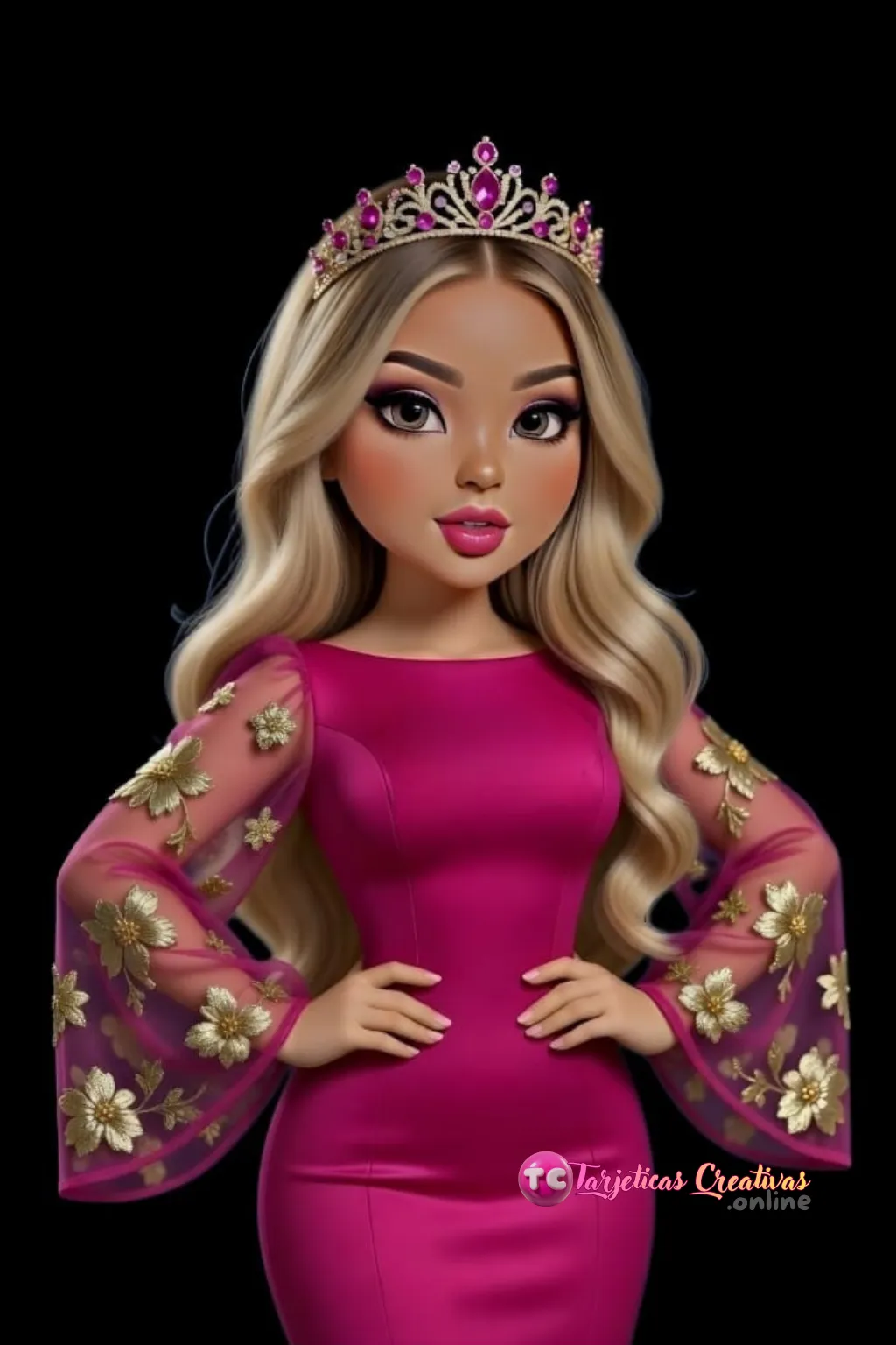 "Diseño elegante de reina con corona de cristales fucsia y vestido de alta costura con detalles dorados"