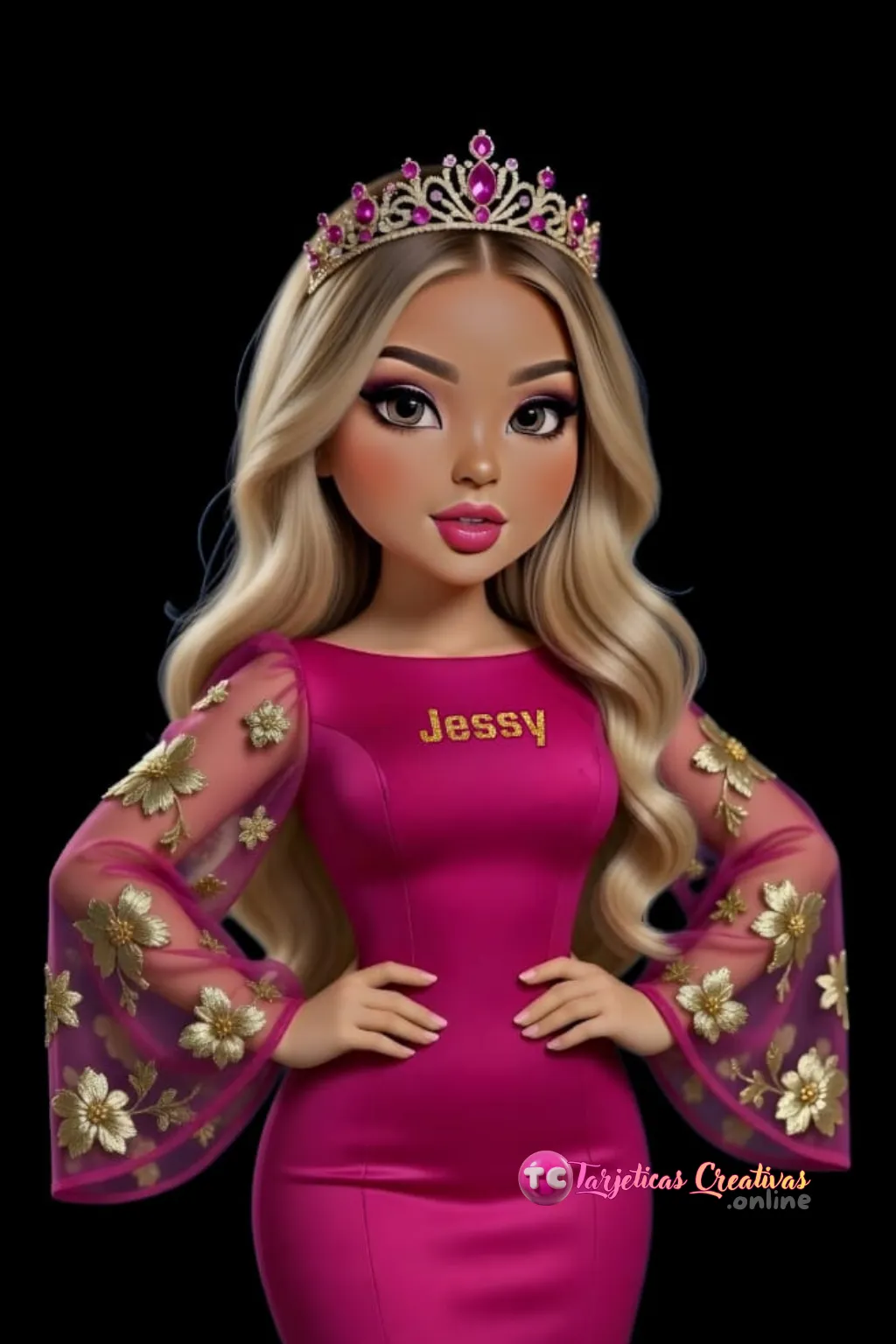 "Diseño elegante de reina con corona de cristales fucsia y vestido de alta costura con detalles dorados"