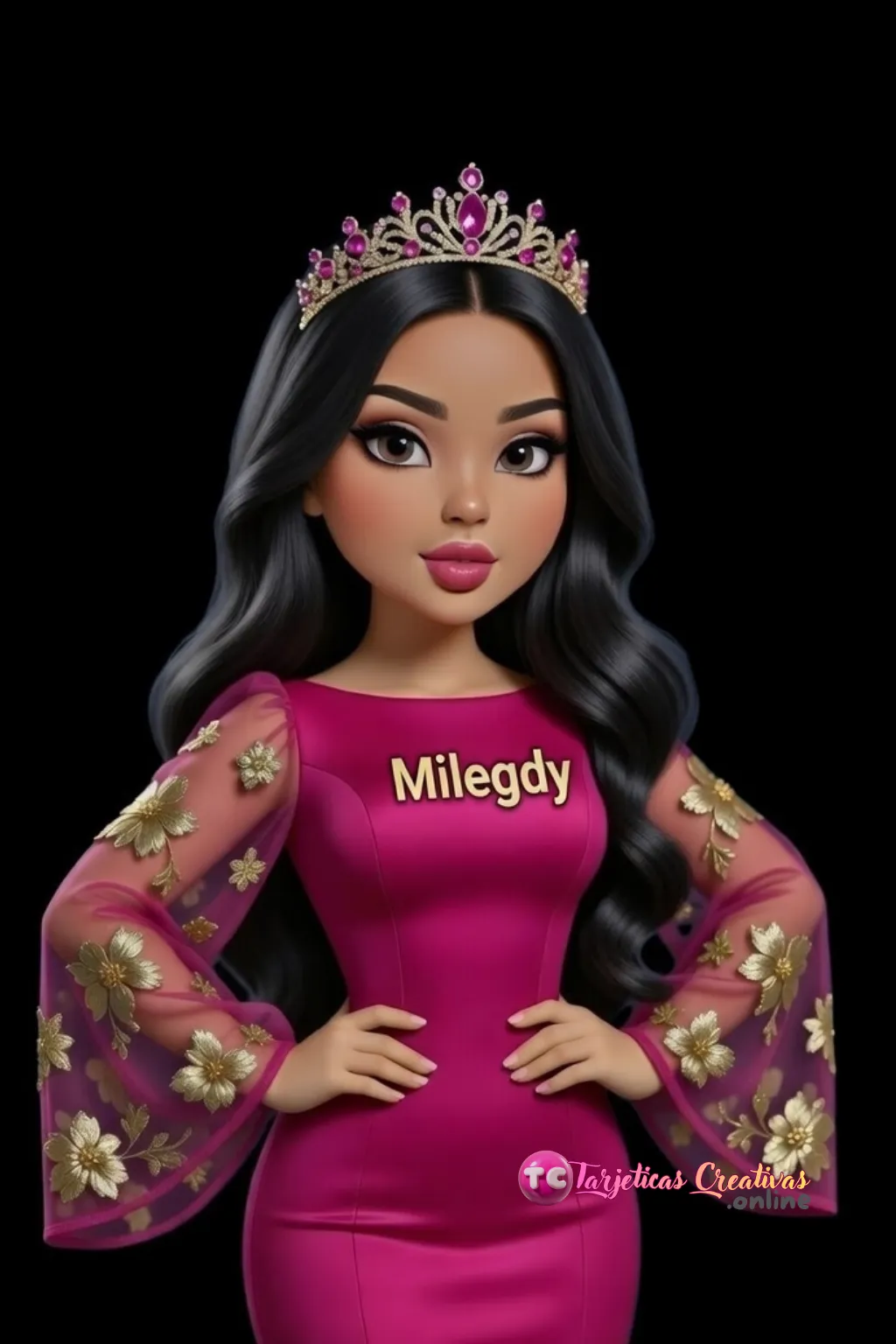 "Diseño elegante de reina con corona de cristales fucsia y vestido de alta costura con detalles dorados"