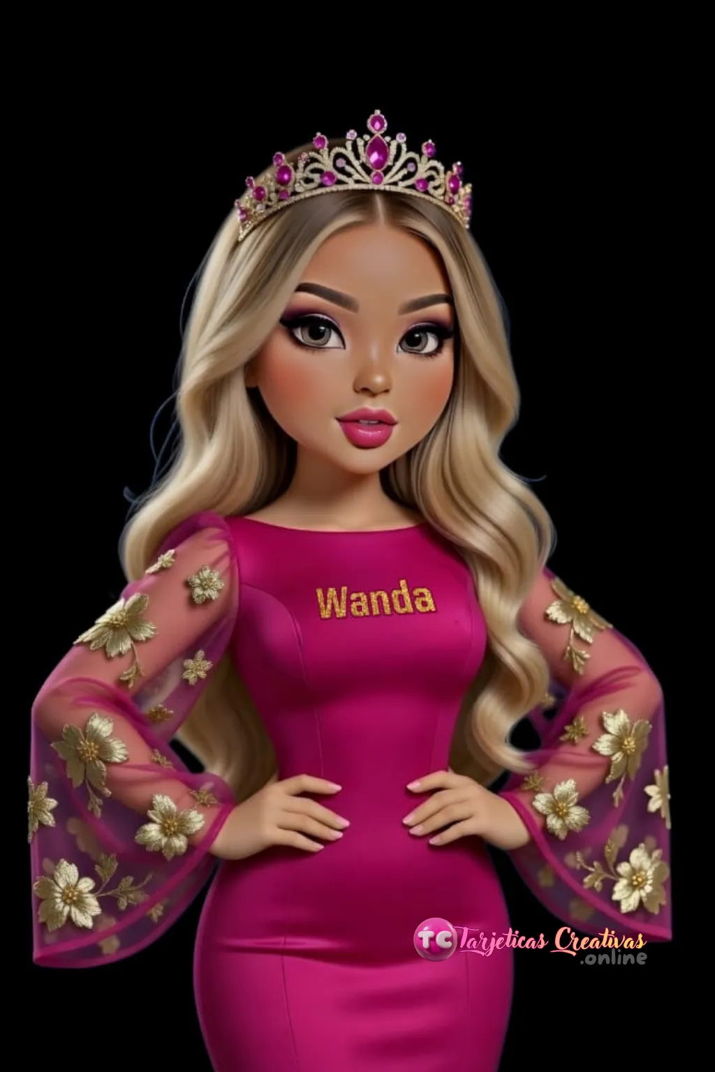 "Diseño elegante de reina con corona de cristales fucsia y vestido de alta costura con detalles dorados"