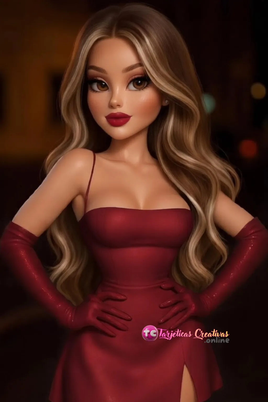 "Diseño sofisticado de mujer con vestido rojo elegante, guantes largos y estética de alta costura"